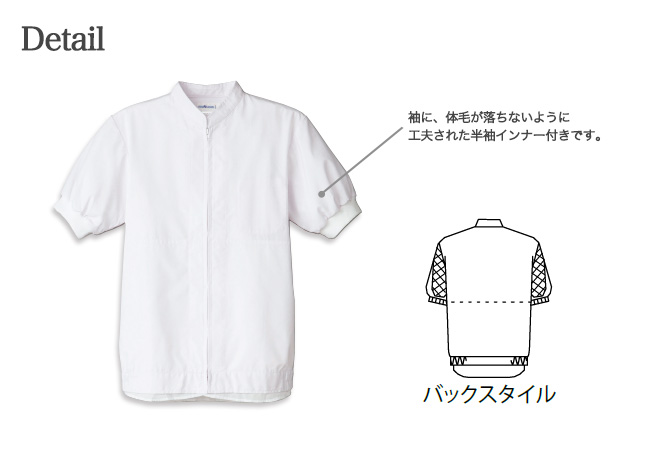 - 抗菌、制電、左胸内ポケット付き、セミオートコイルファスナー、マジックテープ(横付け)、異物混入対策仕様トップス、袖口フライス仕様、インナー半袖