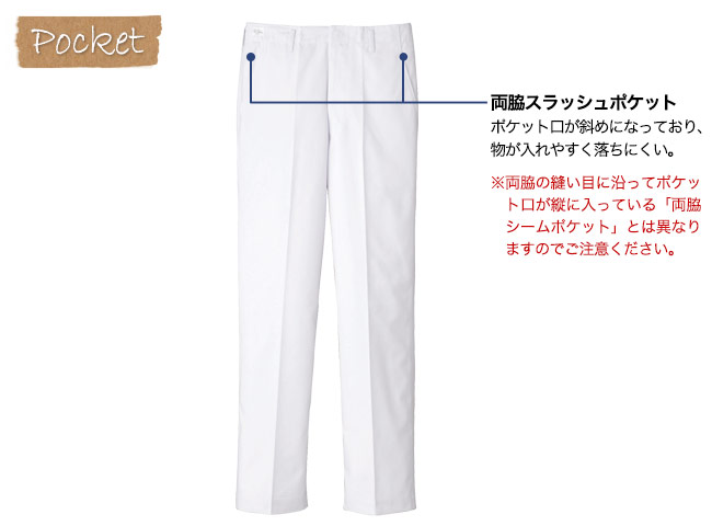 - 右後片玉縁ポケット付き 両脇スラッシュポケット付(ポケット口が斜め) ※両脇の縫い目に沿ってポケット口が縦に入っている 「両脇シームポケット」とは異なりますのでご注意ください。
