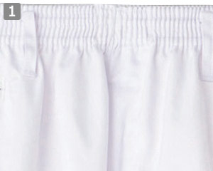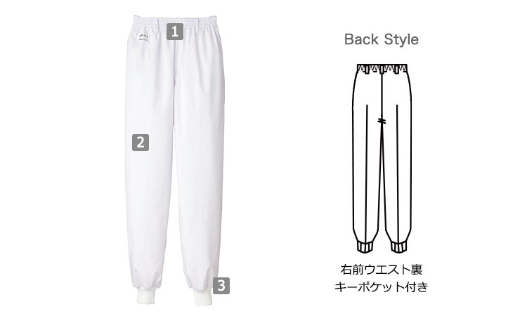- ウエスト:総ゴム、縫製仕様:パイピング、本体袖口:フライス、右前ウエスト裏キーポケット付き