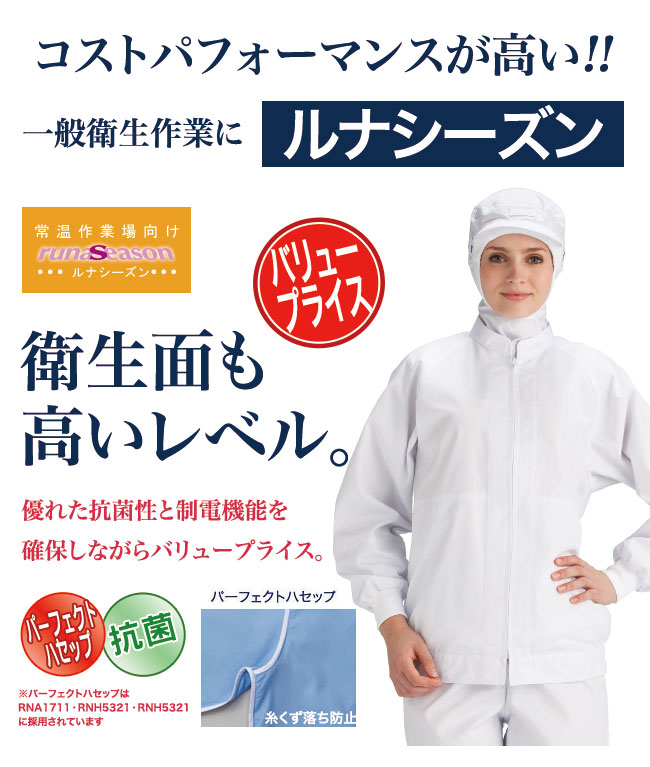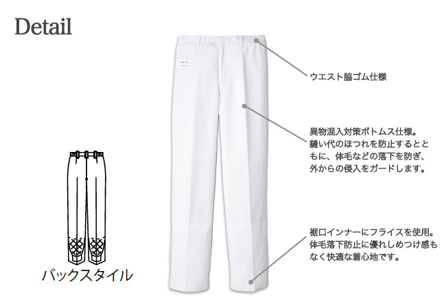 ■仕様:抗菌、制電、ハセップ支援、ウエスト脇ゴム、異物混入対策仕様ボトムス、キーポケット付き、裾口フライス仕様