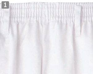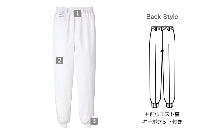 - ウエスト:総ゴム、縫製仕様:パイピング、本体袖口:フライス、右前ウエスト裏キーポケット付き