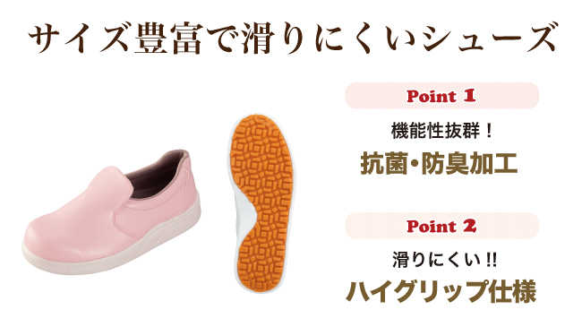 - ハイグリップ仕様、抗菌、防臭、耐油、防滑ソール