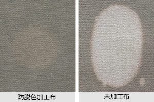 EVERS®-Ⅱという防脱色加工を施した生地。この防脱色加工は、塩素系漂白剤による退色を抑制し、漂白剤の付着による変色を軽減します。(方法:市販塩素系漂白剤を水で1/3希釈し滴下。24時間放置後、洗濯し乾燥後の変退色を比較。)