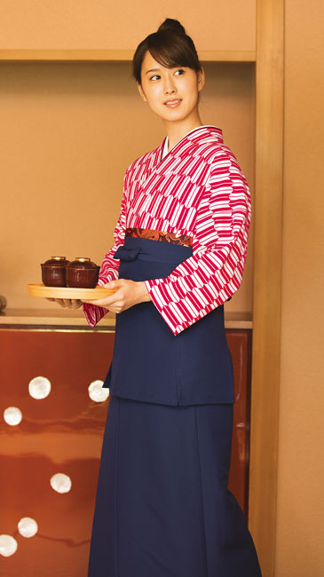 落ち着いた色合いで、和風のコーディネートにおすすめの前掛けです。二部式着物、茶衣着と組み合わせる事でよりお店にあった和の装いが可能です。