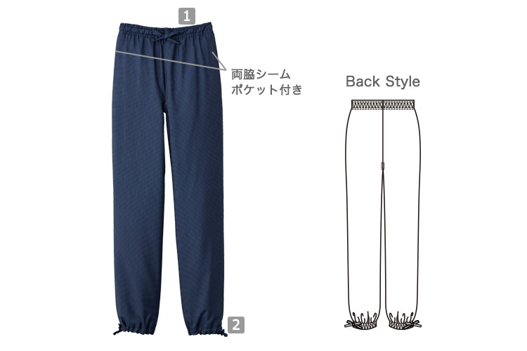 ウエスト総ゴム仕様で動きやすく快適な着用感です。また、裾のゴムがきつすぎないため、ゆったり穿けます。