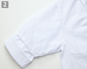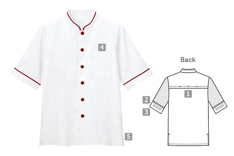 五分袖の内側にネットがついていて、体毛や異物の落下を防いでくれます。飲食店やパン屋さん、カフェや給食センターなどで安心して着用いただけます。