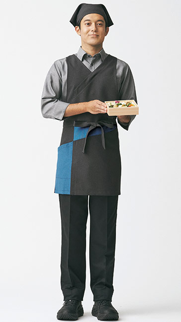上から下まで和のユニフォームを揃えなくてもこのエプロンだけで「和」を感じさせる事ができ、コストパフォーマンスも抜群です。