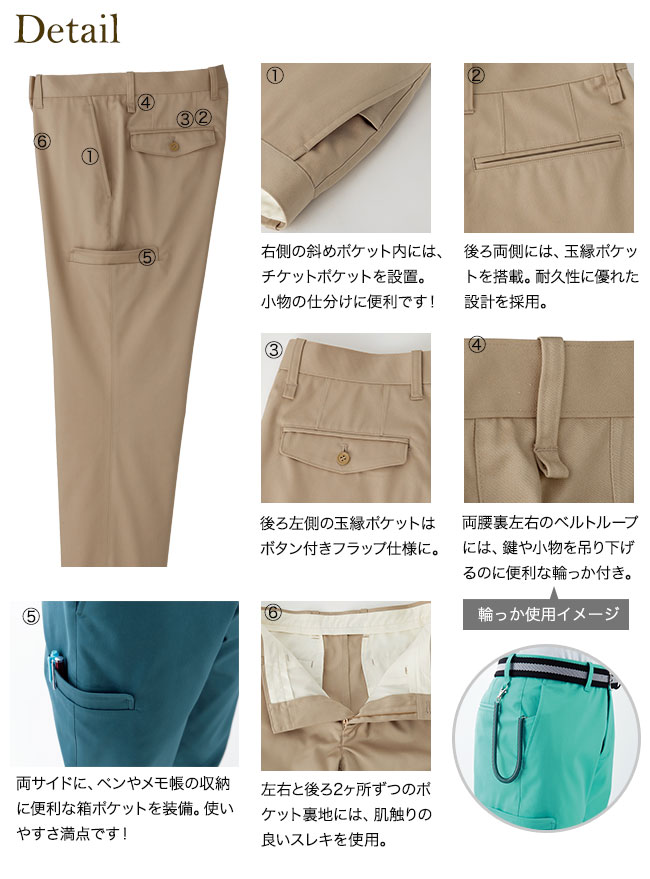 - 両腰斜めポケット、右側チケットポケット、両脇箱ポケット、後ろ両側両玉縁ポケット、左側フラップ付ボタン止め、ベルトループ後ろ左右輪っか付き