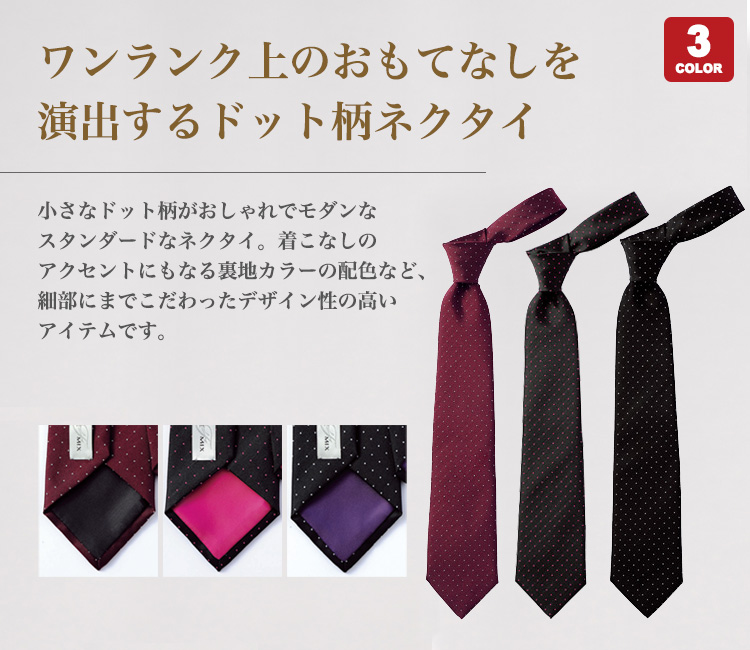 ドット柄がおしゃれなスタンダードなネクタイ。つけるだけでワンランク上のおもてなしを演出します。