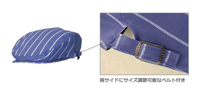 両サイドにサイズ調節が可能なベルト付き。自分の頭の大きさに合わせて被ることは、飲食店などの身なりをきちんとしなければならない場には重要なポイントです。