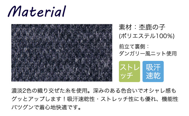 - 杢鹿の子(ポリエステル100%)前立て、袖裏側:ダンガリー風ニット素材使用