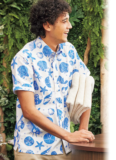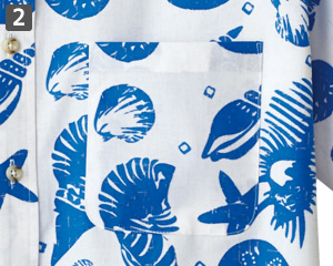 爽やかな貝柄のアロハシャツ。少し派手目なデザインながらもボタンダウン仕様できちんと感をプラス。