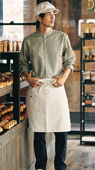 カフェやベーカリー、ショップ等さまざまなシーンに合わせやすい長袖シャツ。襟元はスタンドカラーよりも低めのバンドカラーを採用し、首まわりがシャープな印象に。