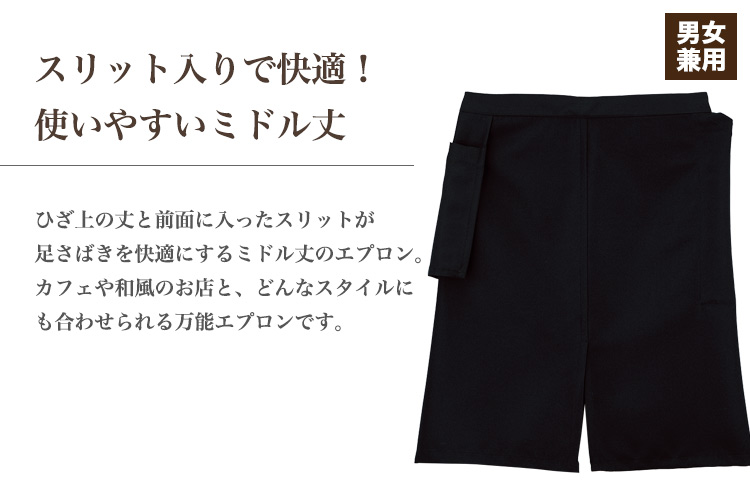 スリット入りで足さばきのよいエプロン。使いやすい豊富なポケットと制電気が起きにくい素材が魅力です。