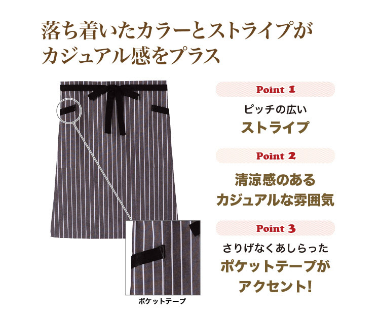 落ち着いた色のベース生地に映えるピッチの広めなストライプのミドルエプロンはカジュアル感をプラスするアイテムです。
