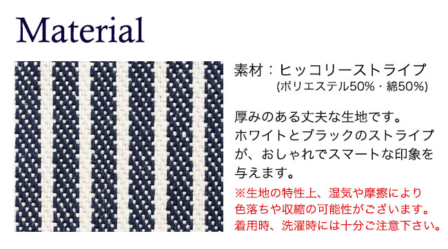 - ヒッコリーストライプ(ポリエステル50%・綿50%)※生地の特性上、湿気や摩擦により色落ちや収縮の可能性がございます。