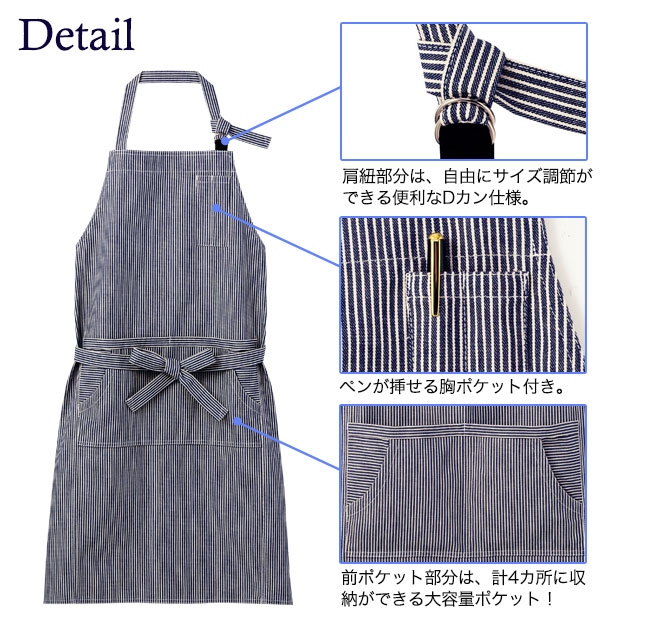 ヒッコリーストライプがラフでかっこいい胸当てエプロン。 デザイン性に優れているだけでなく、 ペン差しポケットやDカン、大容量のポケットなど、 使いやすさも考慮された働く人のためのエプロン。