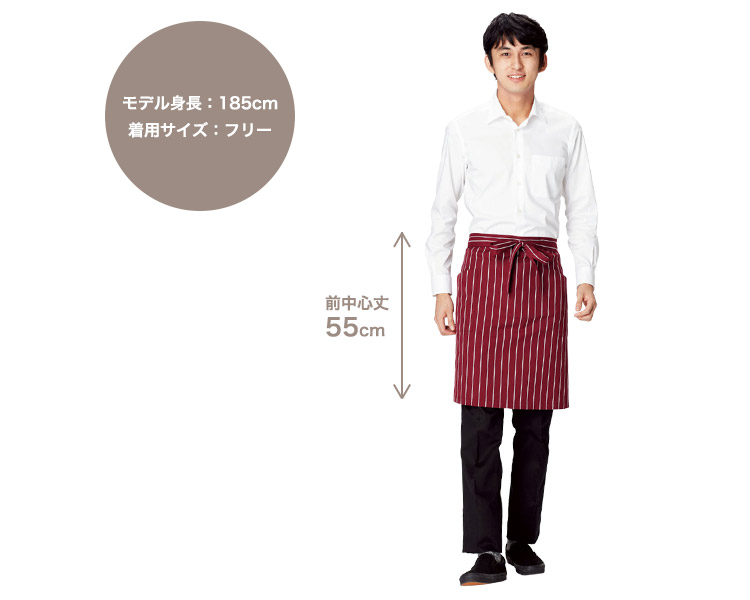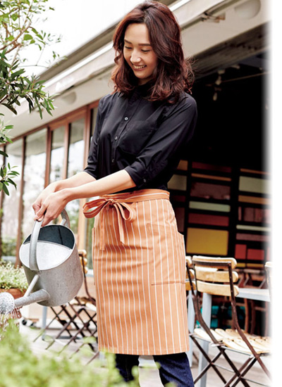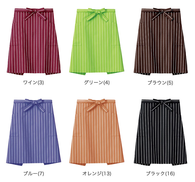 幅広ピッチでカジュアルなストライプ柄のミドルエプロン。シックな色から明るい色まで豊富な6色展開でコーディネートの幅が広がります。