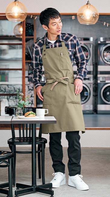優しいアースカラーの配色を利かせた胸当てエプロン。丈夫で耐久性のあるツイル素材にポリエステル高混率で扱いやすい生地を採用しています。ナチュラルでやさしい色味の生地に撥水機能が備わっていることで、合わせる装いも空間も選ばない、汎用性の高さ。普段遣いにもおすすめです!
