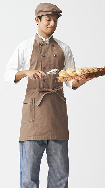 コックコートとエプロンを融合させた新しいデザインながら、色合いやボタンなどのディテールがどこか懐かしいヴィンテージの雰囲気を醸し出し、大人の粋な雰囲気に。