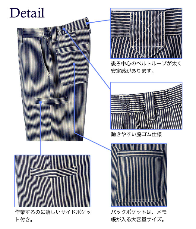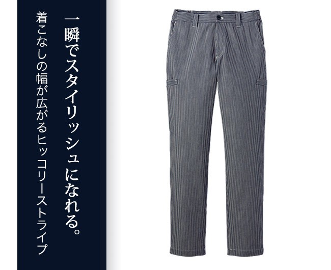 スタイリッシュでカジュアルなストライプ柄のヒッコリーパンツ。