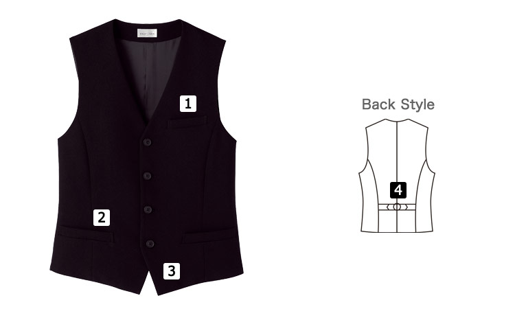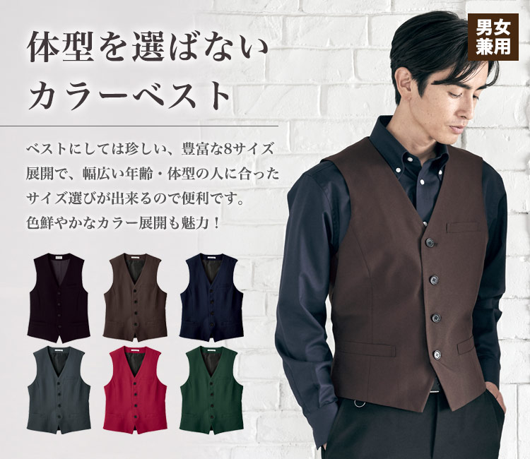 ベストにしては珍しい、豊富な8サイズ展開で、幅広い年齢・体型の人に合った サイズ選びが出来るので便利です。 価格もリーズナブルで揃えやすいのもおすすめポイントです。 ワンランク上のサービスにふさわしく、飲食店、フォーマルシーンで活躍します。