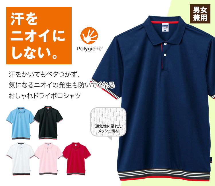 ニオイ悩みを解消するポリジン・バイオスタティック素材のドライポロシャツ。銀イオンの力で細菌の繁殖を抑え、ニオイの発生を徹底的に防ぎます。吸汗速乾性に優れており、汗をかいてもさらっとした着心地です。