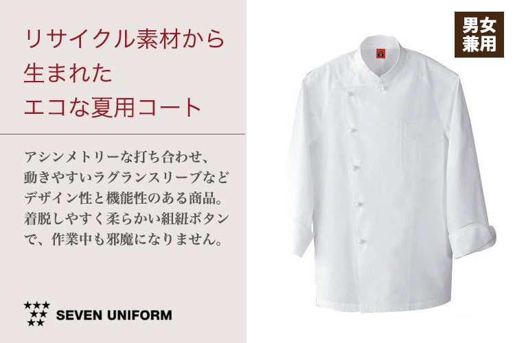 夏用のコックコートです。アシンメトリーな打ち合わせ、動きやすいラグランスリーブなど、デザイン性と機能性のある商品です。着脱しやすく柔らかい組紐ボタンで、作業中も邪魔になりません。古い綿素材のユニフォームをリサイクルしたエコ商品! ヴァージンコットンに劣らぬ品質で機能的なユニフォームに再生しました。自然食やスローライフ志向の店舗にオススメです。
