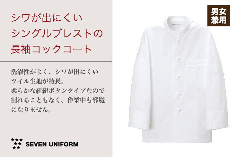 業界老舗、最大手の一流ブランドメーカー、セブンユニフォームのシワが出にくい素材を使用したシングルブレストタイプのコックコート。