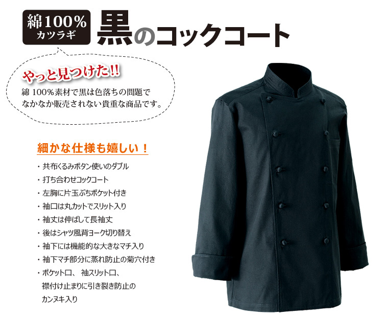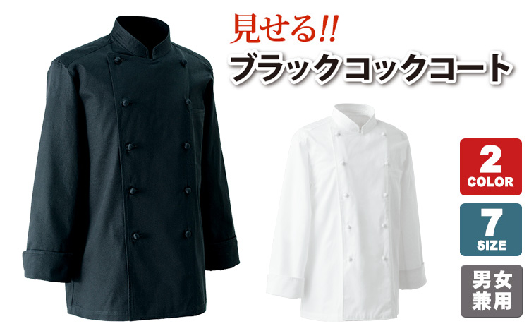 袖下に大きなマチの入った、機能的な白黒2色のコックコート。 丈夫で風合いの良いカツラギ素材を使用。