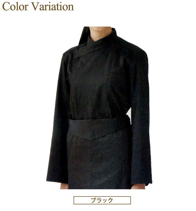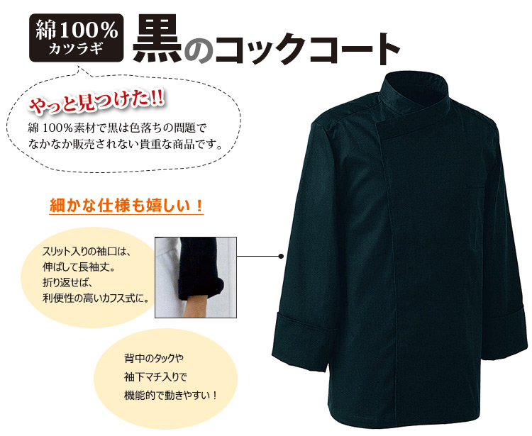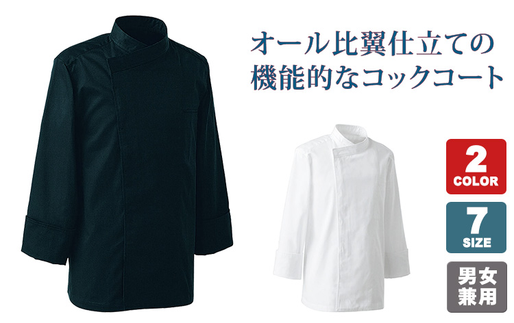 背中のタックや袖下のマチが機能的な白黒2色のコックコート。 丈夫で風合いの良いカツラギ素材を使用。