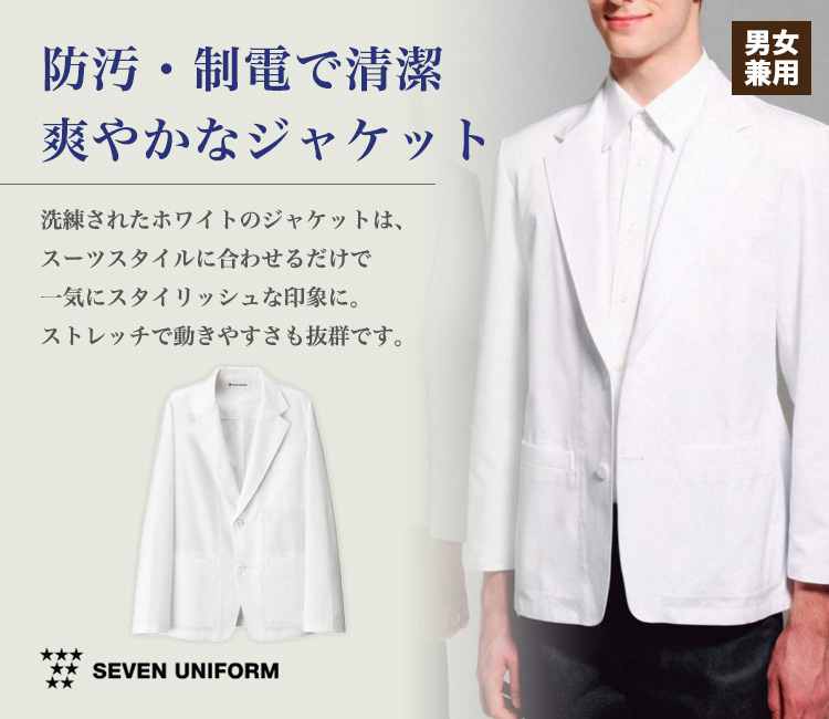 スタイリッシュで清潔感のあるホワイトジャケット。 ストレッチ性があるため動きやすく、防汚加工が施されているため、 白いユニフォームで気になりがちな汚れにも安心。 制電加工のため静電気の発生を防ぎ、ゴミや髪の毛の付着を防止します。