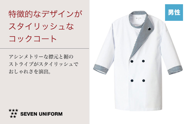 業界老舗、最大手の一流ブランドメーカー、セブンユニフォームの男性用七分袖コックコート。アシンメトリーな襟元と裾のストライプが特徴的でスタイリッシュ。