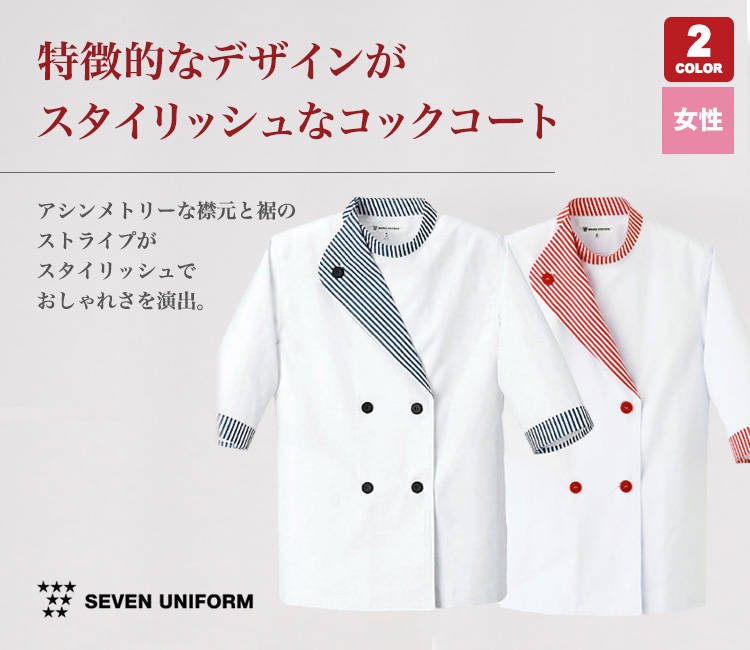 業界老舗、最大手の一流ブランドメーカー、セブンユニフォームの女性用七分袖コックコート。アシンメトリーな襟元と裾のストライプが特徴的でスタイリッシュ。