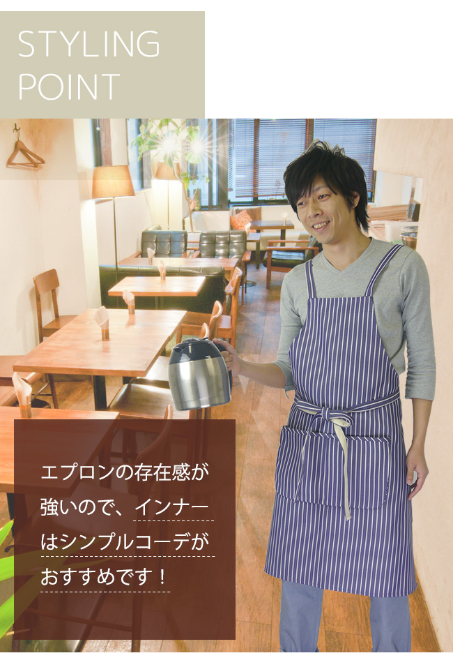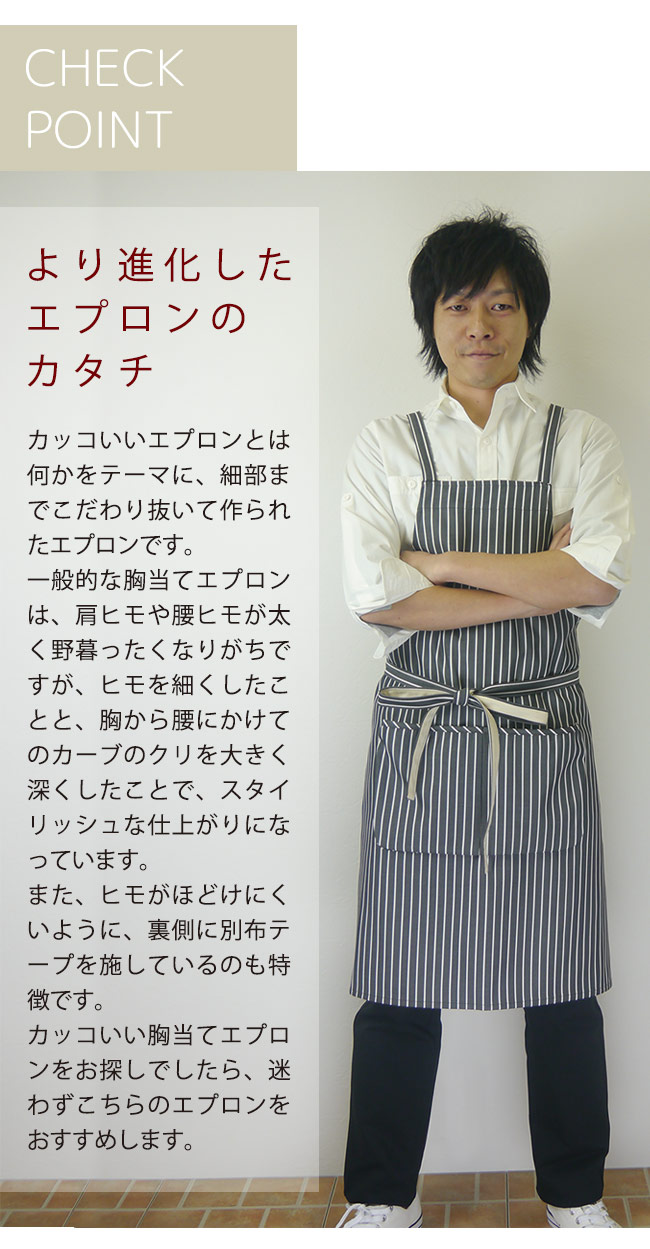 カッコいいエプロンとは何かをテーマに細部までこだわって作られたエプロン。 肩ヒモや腰ヒモが細くスタイリッシュな仕上がり。