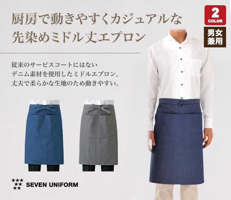 業界老舗、最大手の一流ブランドメーカー、セブンユニフォームの男女兼用ミドル丈エプロン。 厨房や店内で動きやすい丈夫で柔らかなカジュアルデニム生地です。