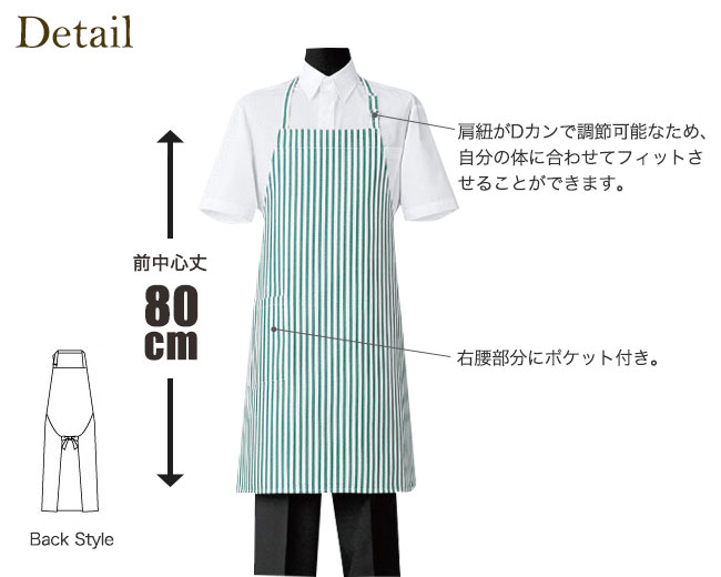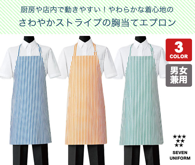 業界老舗、最大手の一流ブランドメーカー、セブンユニフォームの男女兼用胸当てエプロン。さわやかストライプで印象アップ! 厨房や店内で動きやすい丈夫で柔らかなカジュアルデニム生地です。