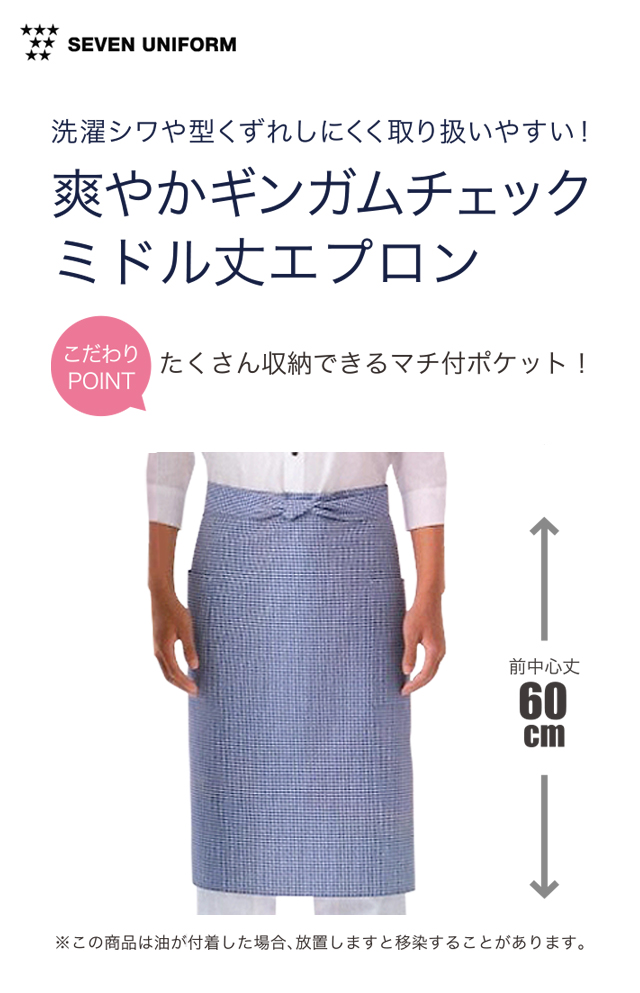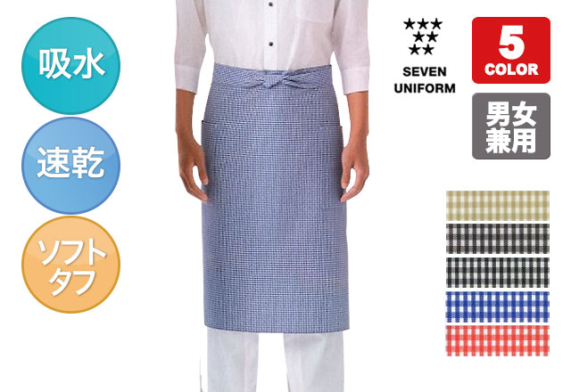 セブンユニフォームの爽やかなギンガムチェックのミディアム丈エプロン。 抜群の形態安定性が特長のソフトタフ素材を使用したシリーズです!