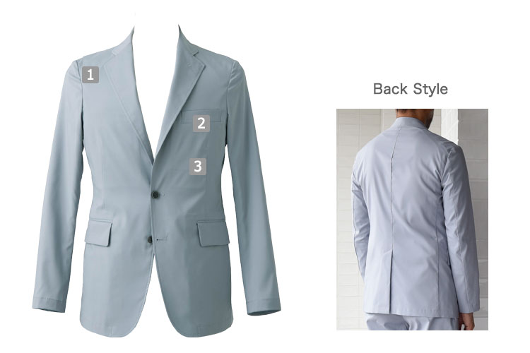 - 裏地なし、内ポケット(2)、左胸ポケット、両脇ポケット