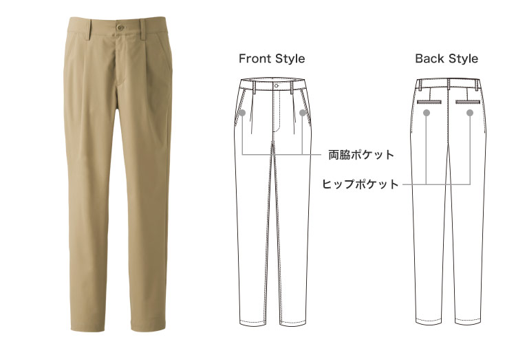 適度なゆとりをつくるワンタック仕様。腰まわりに遊びができ、動きやすい仕様です。