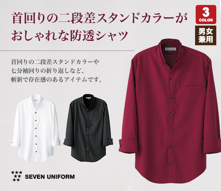 シャツ(七分袖)[男女兼用] ナチュラルな開襟の2段差スタンドカラーシャツです。防透視仕様の素材で出来ています。シャープなカッティングが斬新で存在感のあるアイテムです。