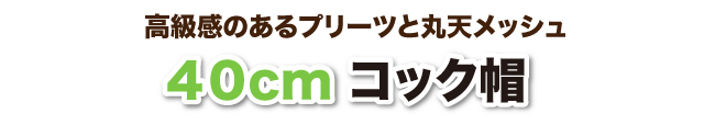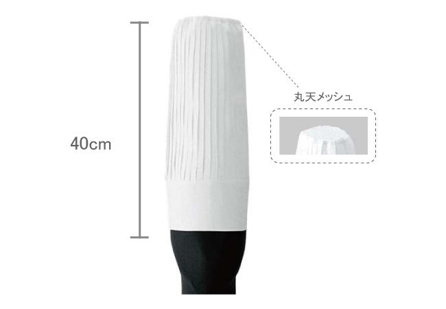 プリーツが高級感溢れる総丈40cmのコック帽です。丸天メッシュ仕様で蒸れずに快適。