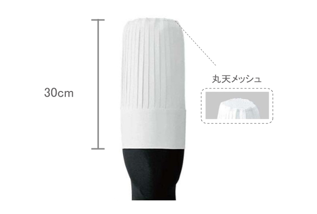 高級感溢れる総丈30cmのコック帽です。丸天メッシュでお仕事を快適にサポートします。