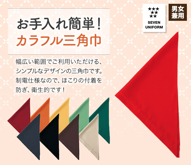 幅広い範囲でご使用いただける、落ち着いた10色から選べる三角巾です。制電性があり、ほこりの吸着などを防ぐことができます。