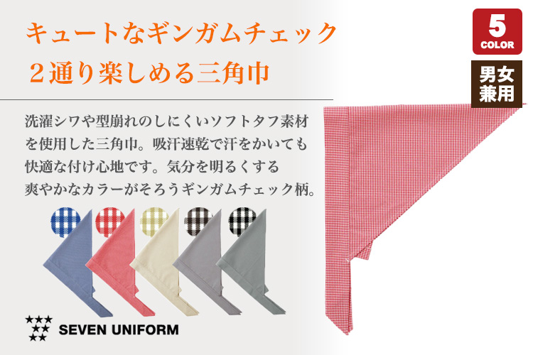 セブンユニフォームの爽やかなギンガムチェックのループ付き三角巾。タイとしても使用可能な2Wayタイプ! 抜群の形態安定性が特長のソフトタフ素材を使用したシリーズです!