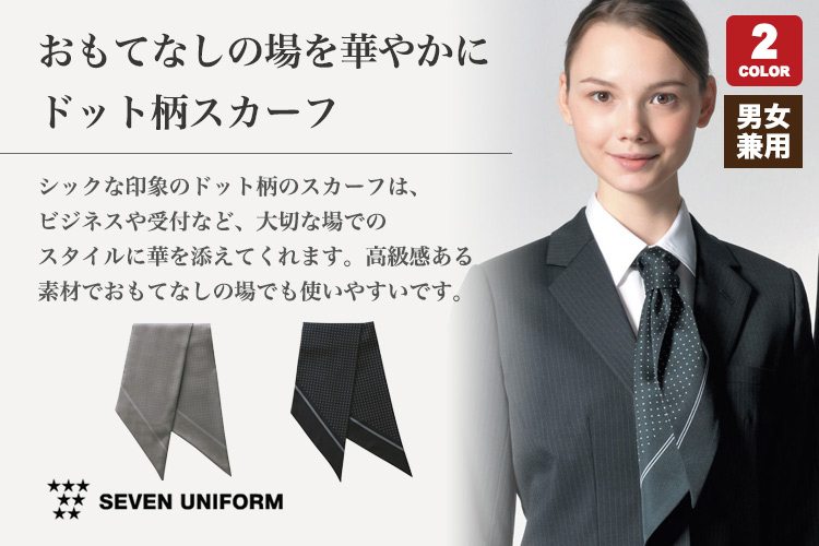 セブンユニフォームのシックな印象のドット柄のスカーフです。ビジネスや受付など、大切な場でのスタイルに華を添えてくれます。高級感ある素材でおもてなしの場でも使いやすいです。