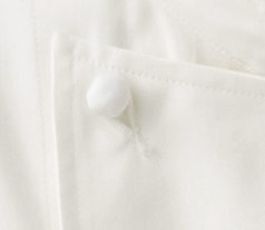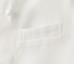 - 左胸箱ポケット、内掛けボタン、共布くるみボタン、袖脇下菊穴、マチ付き