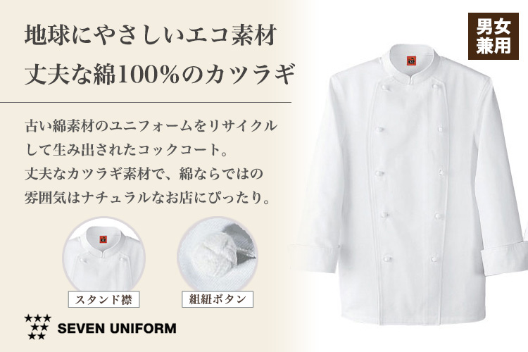 古い綿素材のユニフォームをリサイクルしたエコ商品! ヴァージンコットンに劣らぬ品質で機能的なユニフォームに再生しました。自然食やスローライフ志向の店舗にオススメです。綿の素材感を活かしたナチュラルな白が特徴。スタンダードな形のコックコートです。丈夫で風合いの良いカツラギ素材使用。着脱しやすく柔らかい組紐ボタンで、作業中も邪魔になりません。左前に内ポケットがついています。