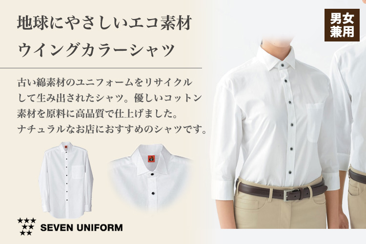 清潔感のあるスタンダードなウィングカラーシャツです。古い綿素材のユニフォームをリサイクルしたエコ商品! ヴァージンコットンに劣らぬ品質で機能的なユニフォームに再生しました。自然食やスローライフ志向の店舗にオススメです。