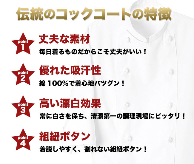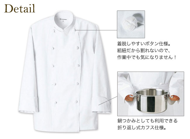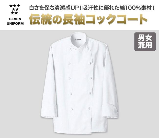 業界老舗、最大手の一流ブランドメーカー、セブンユニフォームのベーシックなスタイルの長袖コックコート。丈夫で風合いの良い、カツラギ素材を使用しています。どのコックコートをお使いの職場でも、夏用として違和感なくお使いいただけます。